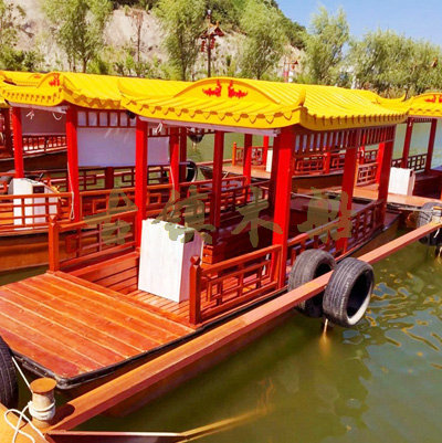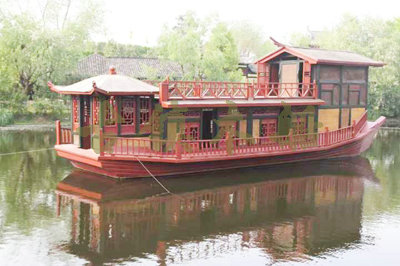 畫(huà)舫船就是裝飾古典華麗的游船,是"中國(guó)風(fēng)"的仿古游船,結(jié)合古典園林建筑,體現(xiàn)了中華文明的古典藝術(shù).畫(huà)舫船豪華而又古典,船上的建筑按照中國(guó)古代建筑里的亭臺(tái)樓閣,建筑工藝之復(fù)雜,要求之嚴(yán)格,仿古畫(huà)舫游船的特點(diǎn)飛檐翹角、玲瓏精致的四角亭子逐漸成形,赫然立于船頭,美人靠、盤(pán)龍柱子、彩畫(huà)……龍柱上的浮雕盤(pán)龍和祥云一層扣著一層,層層錯(cuò)落有致,雕刻精細(xì)到盤(pán)龍身上的每一個(gè)鱗片都細(xì)細(xì)可數(shù),古代皇家標(biāo)志性元素,在畫(huà)舫船上體現(xiàn)的淋漓盡致。除了雕刻、花窗,整條船還有一個(gè)看點(diǎn),那就是弧線(xiàn)優(yōu)美、高高翹起的船尾。游船并不大,長(zhǎng)約10米、寬3米,但是整體看起來(lái)堪稱(chēng)一件藝術(shù)品。船尾的雕花欄桿與船艙、船頭的雕刻遙相呼應(yīng),船身四周貼著浮雕祥云,給整條船增添了富貴、華麗的氣質(zhì)。